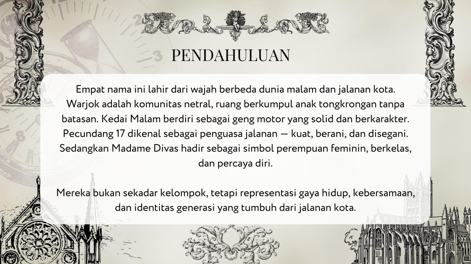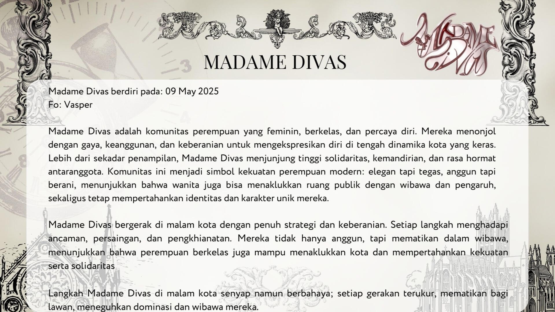 Sedangkan Madame Divas hadir sebagai simbol perempuan feminin, berkelas, dan percaya diri.Mereka bukan sekadar kelompok, tetapi representasi gaya hidup, kebersamaan, dan identitas generasi yang tumbuh dari jalanan kota.