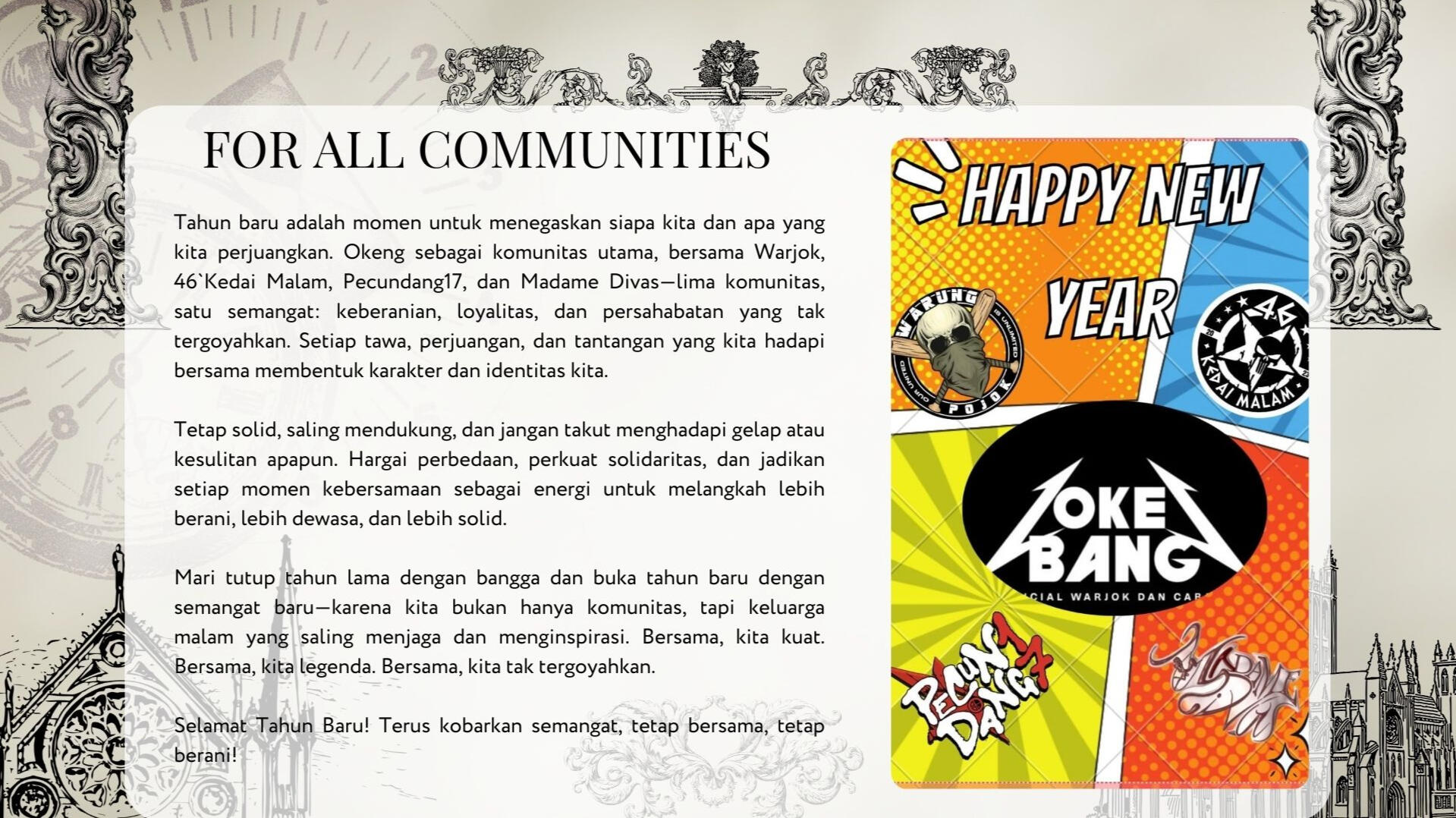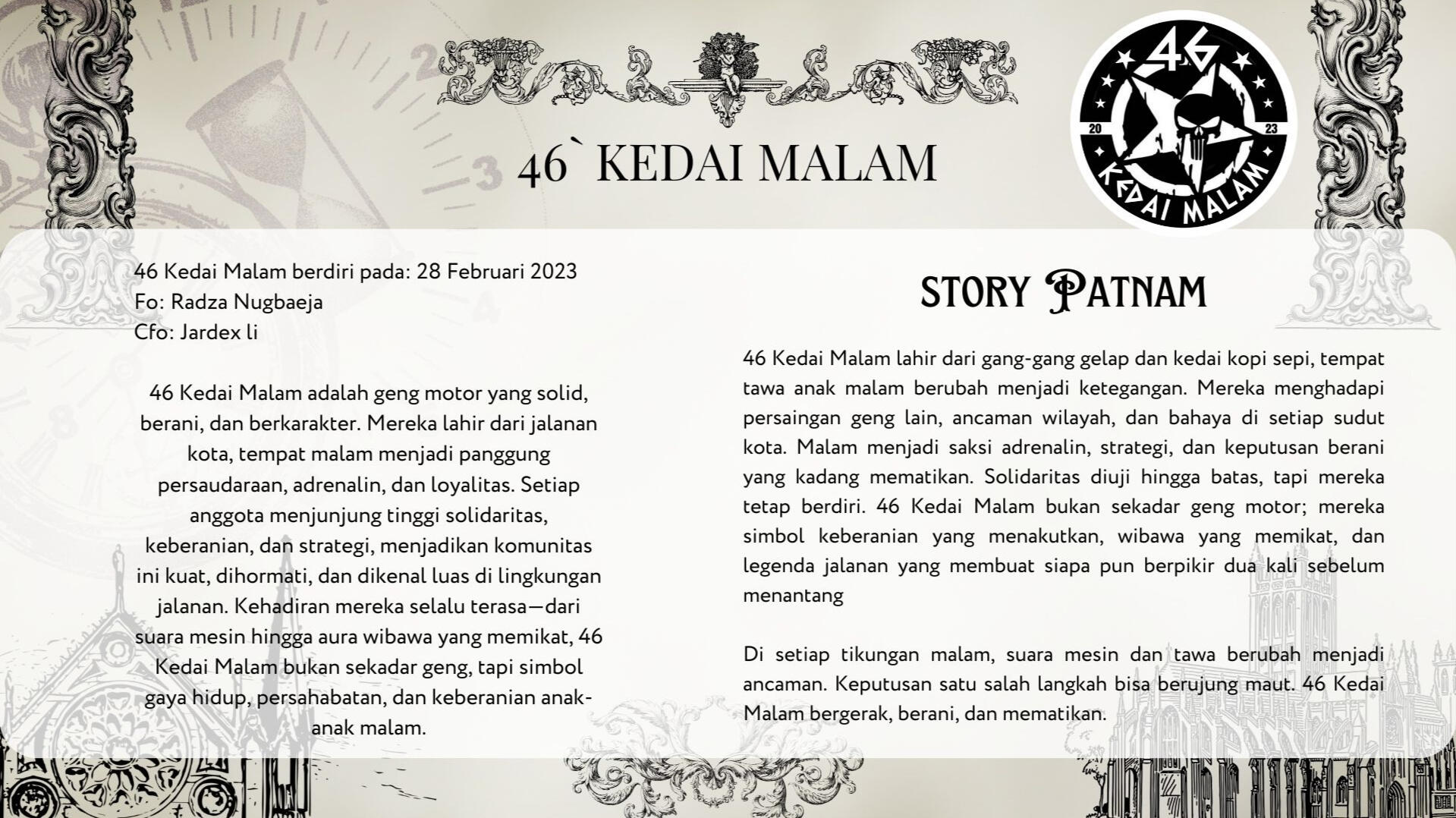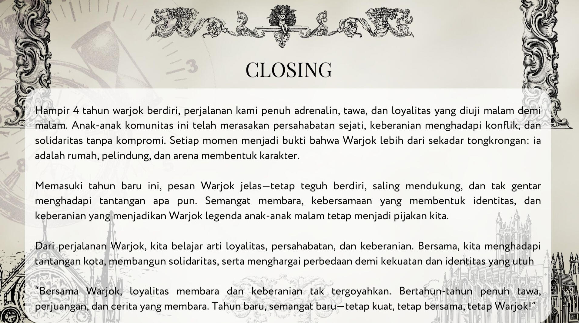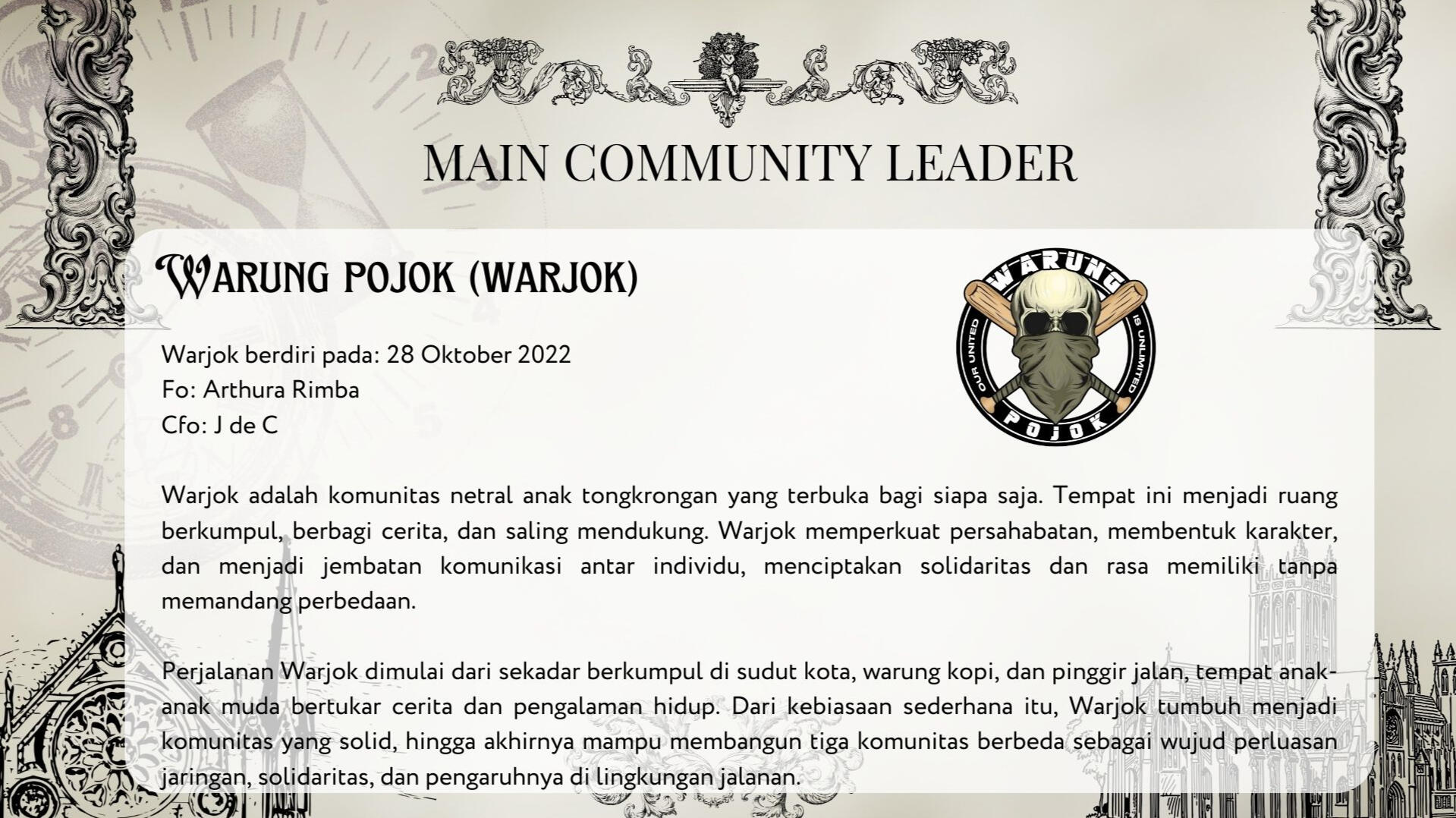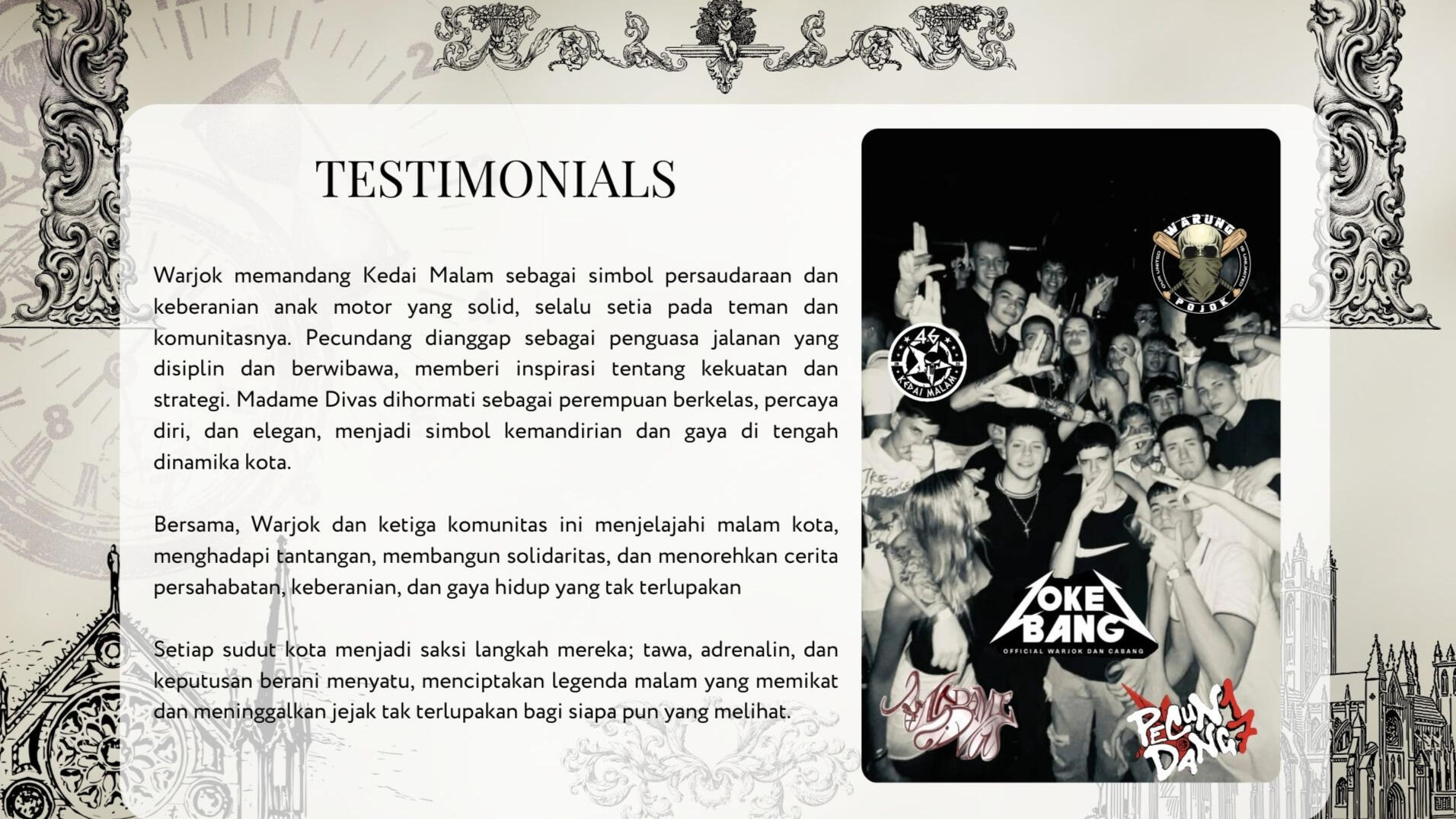 Warjok adalah komunitas netral, ruang berkumpul anak tongkrongan tanpa batasan. Kedai Malam berdiri sebagai geng motor yang solid dan berkarakter.